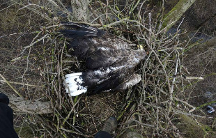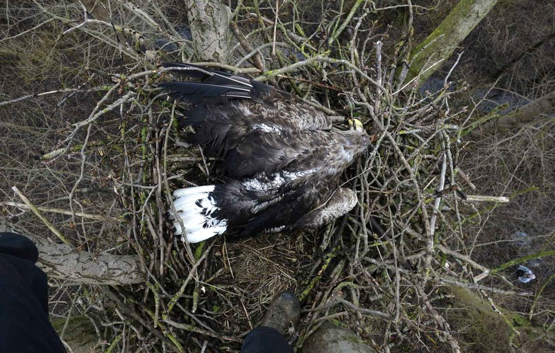 Am Freitag den 12. Februar konnte der Seeadler von dem zertifizierten Baumkletterer Joachim Neumann geborgen werden. Der Adler hatte ein Ästchen im Schnabel, er ist also vermutlich beim Nestausbessern gestorben.